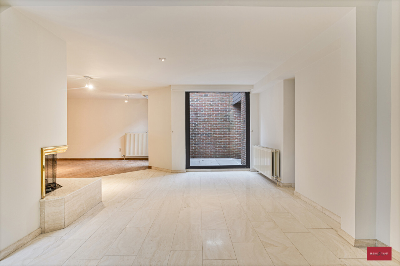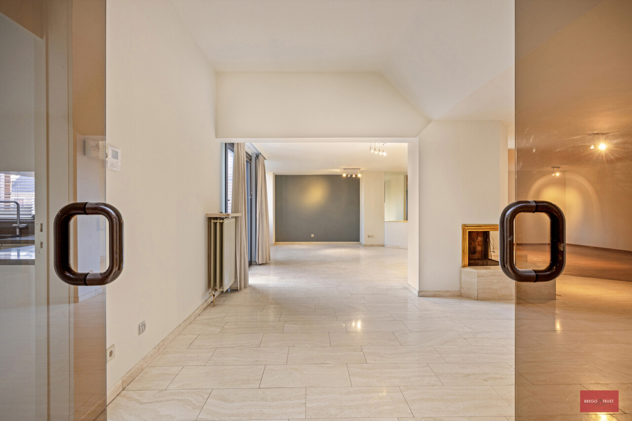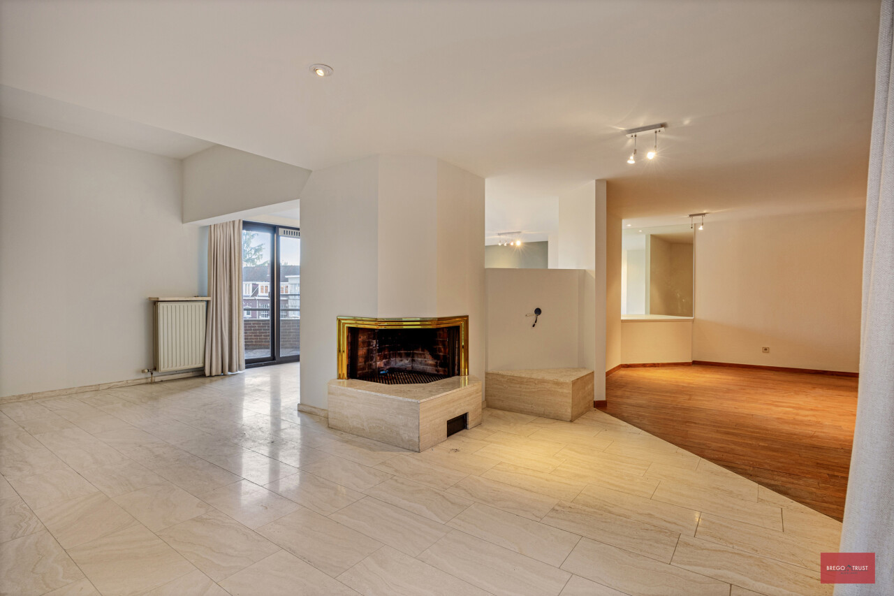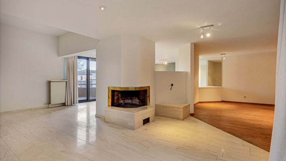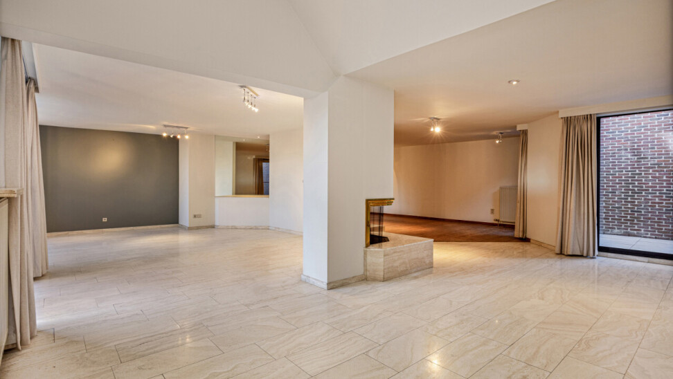 Sfeervol ingedeeld in twee salons waarvan één op parketvloer voorzien van een stijlvolle openhaard en nog een ruimte voor de eetkamer op travertin vloeren.