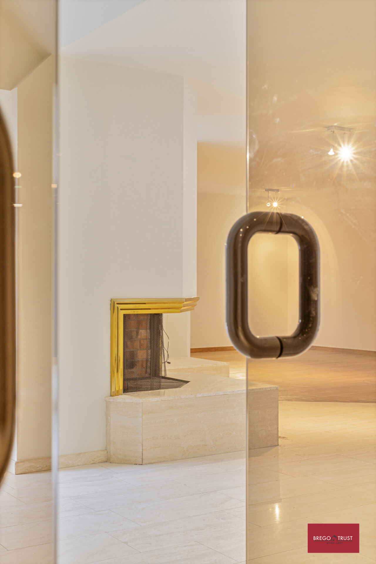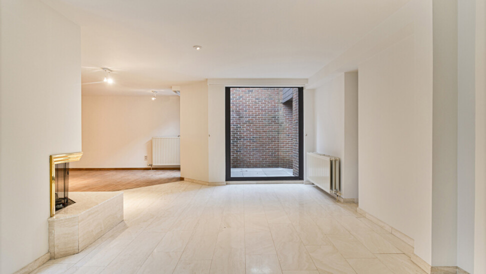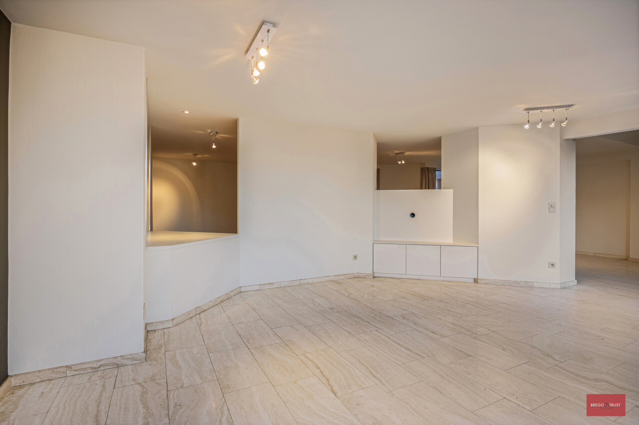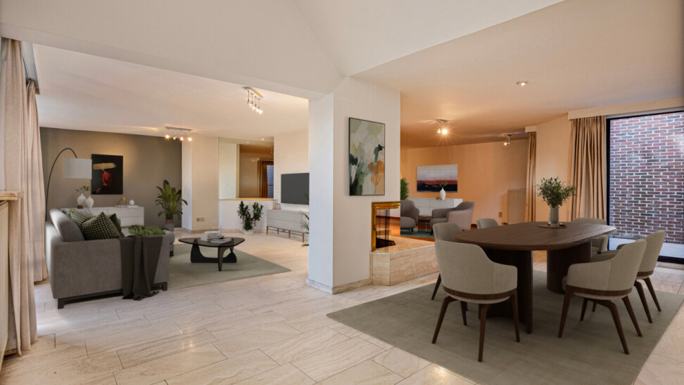 Sfeervol ingedeeld in twee salons waarvan één op parketvloer voorzien van een stijlvolle openhaard en nog een ruimte voor de eetkamer op travertin vloeren.