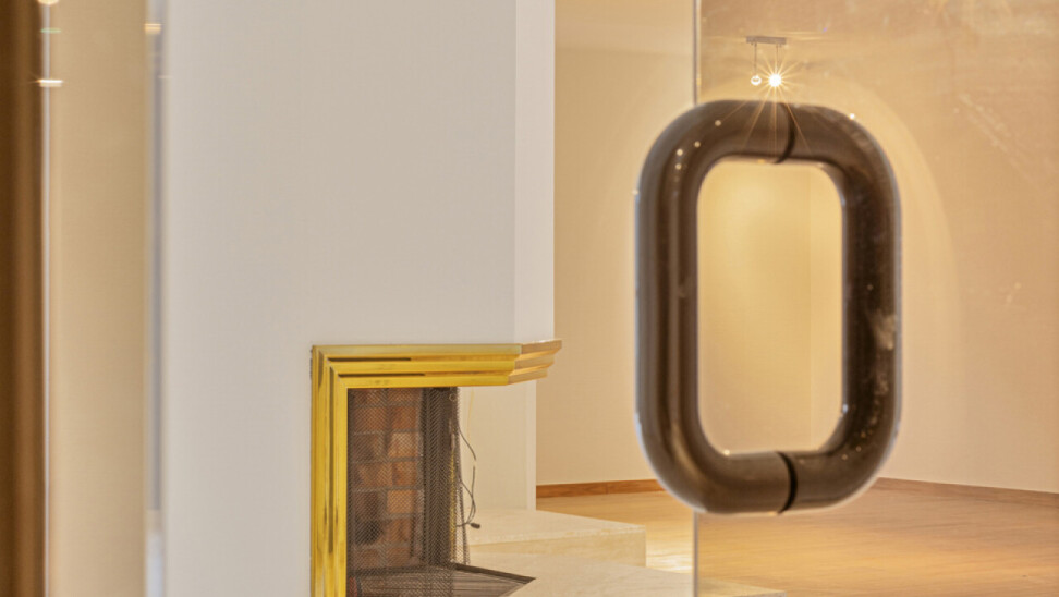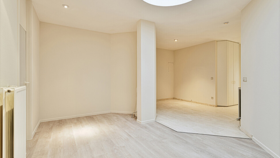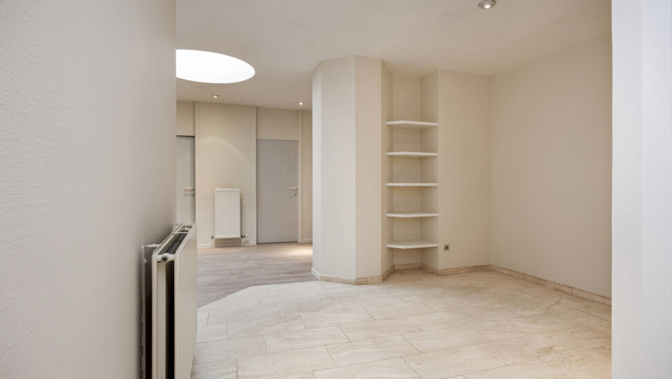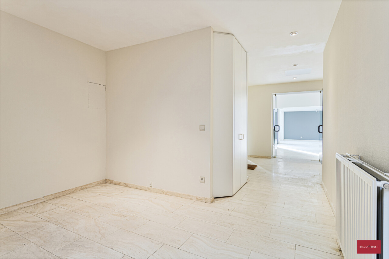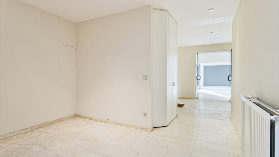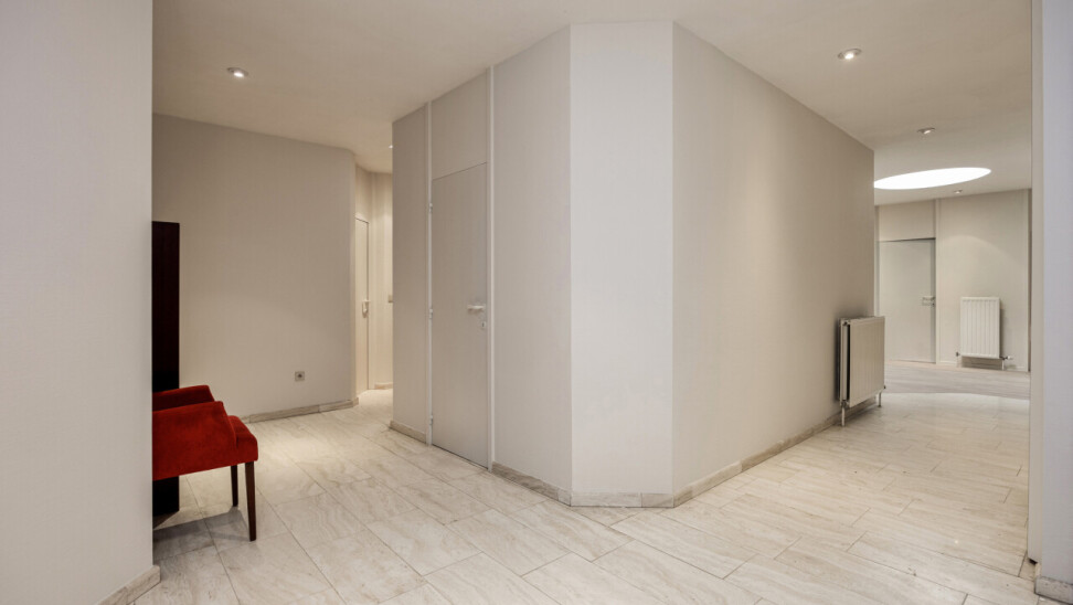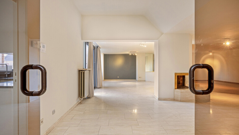 De ruime inkomhal met vestiaire en gastentoilet geven via de gefumeerde glazen deuren toegang tot een zeer ruime leefruimte van ca.100m².