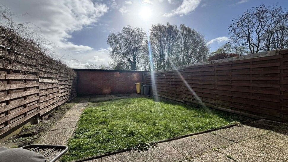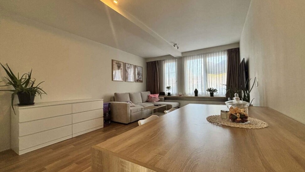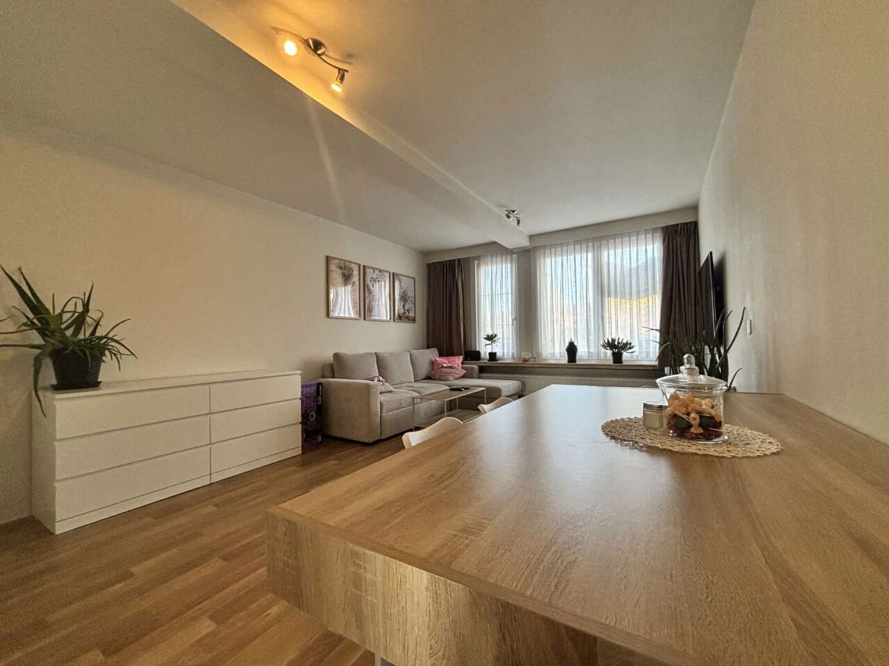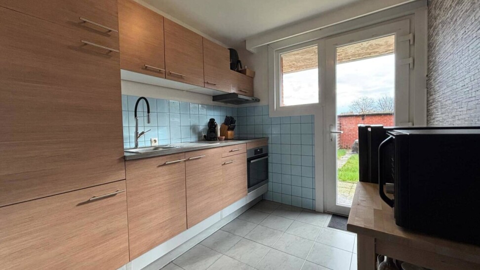 Gelijkvloers éénslaapkamer appartement met garage & tuin. entree, living, keuken met toestellen (koelkast, oven, gas kookvuur, dampkap).Badkamer (ligbad) en apart toilet. één slaapkamer. Tuin en garagebox. Geen huisdieren.