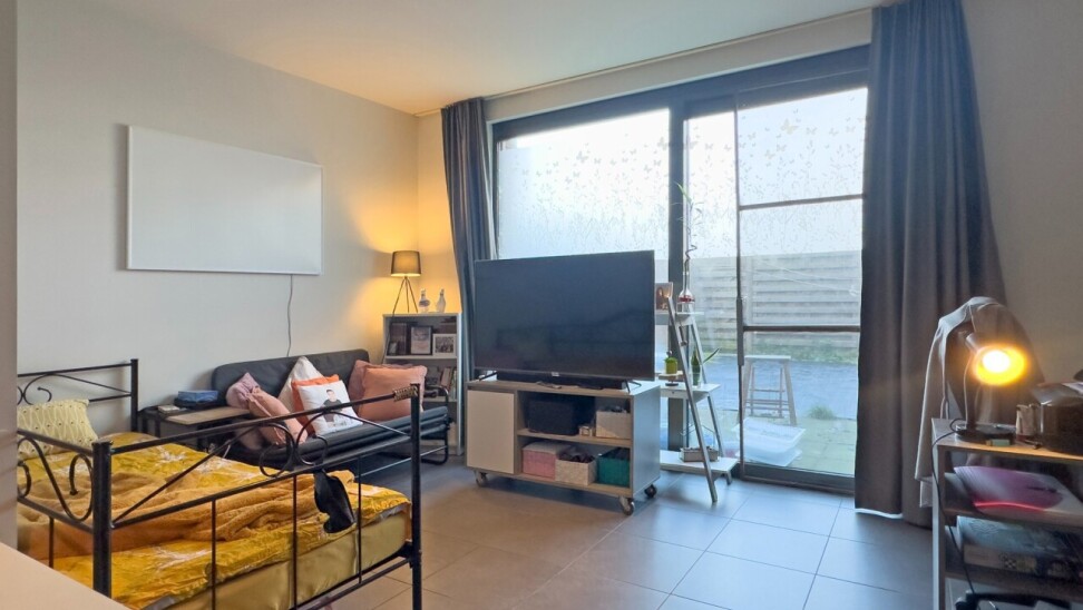 Gelijkvloers: inkomhal, gastentoilet, gezellige leefruimte, slaapkamer (8,74m²), keuken voorzien van noodzakelijke toestellen en berging.