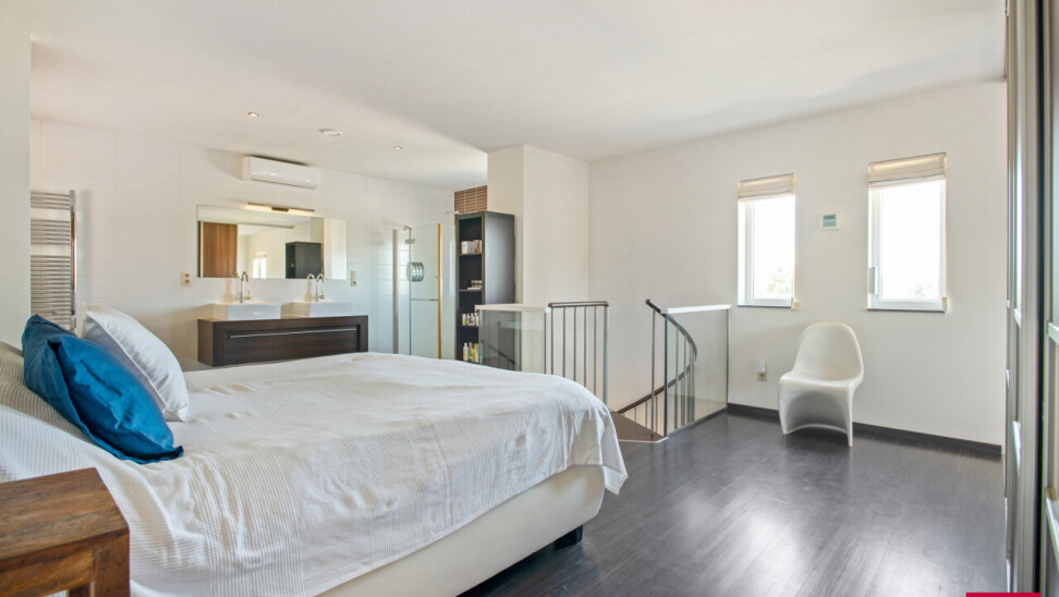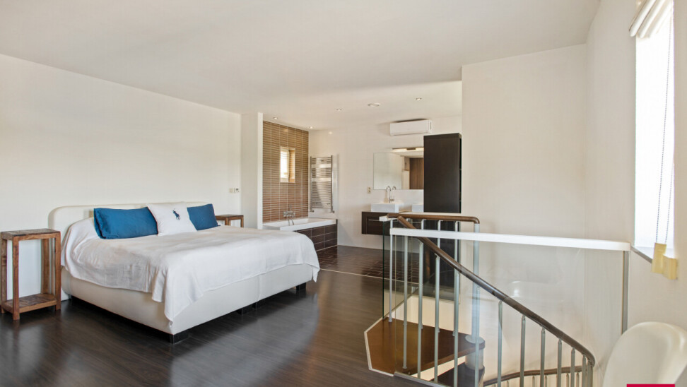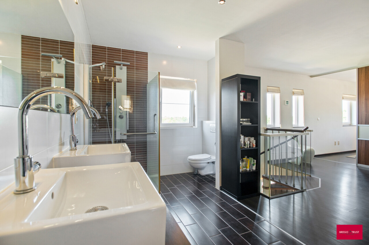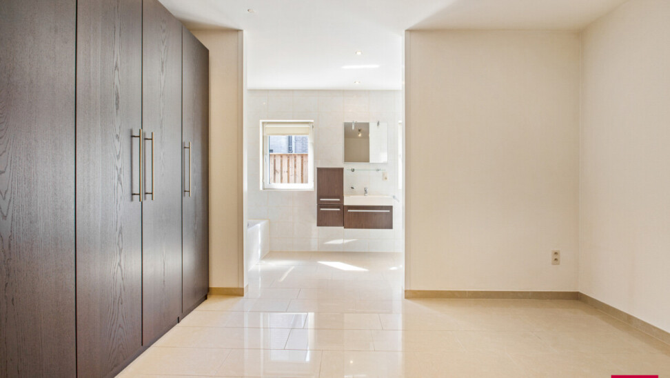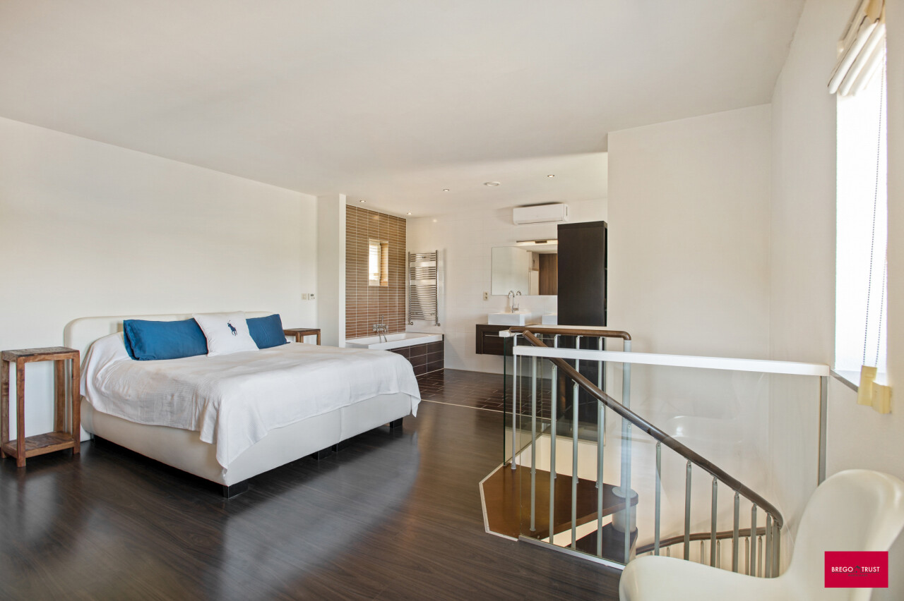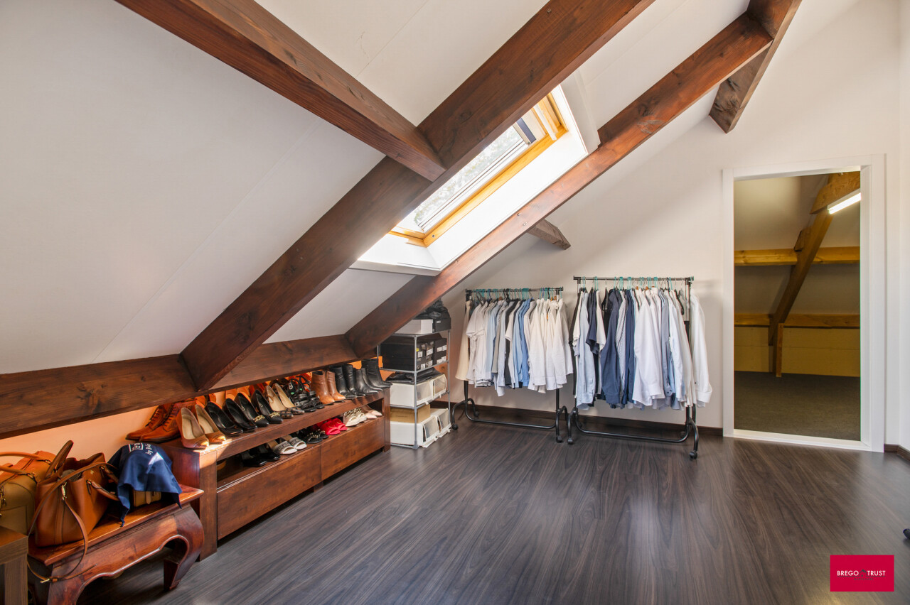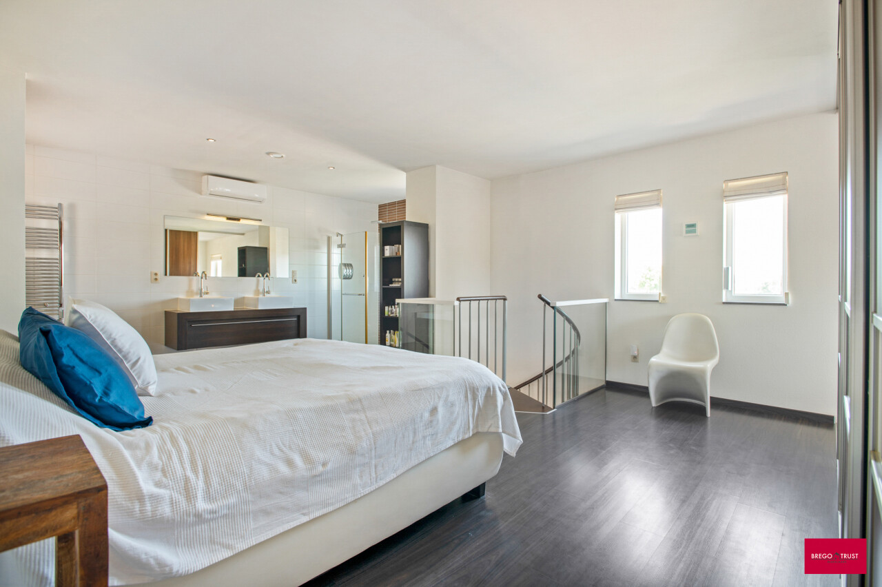 Via de inkomhal bereiken we ook het tweede woongedeelte. Ook hier valt de open leefruimte met keuken meteen op door haar lichtinval en aangename indeling. De bijkeuken zorgt opnieuw voor extra functionaliteit. We nemen de trap naar boven en daar ontdekken we een ruime master bedroom met een elegante ensuite badkamer, die samen een prachtig loftgevoel geven. Daarnaast zijn er nog een extra slaapkamer en een ruime inloopkast voor optimaal comfort. Vanuit deze verdieping is er toegang tot een ruime zolder, die tal van mogelijkheden biedt: extra kamers, hobbyruimte of extra bergruimte.