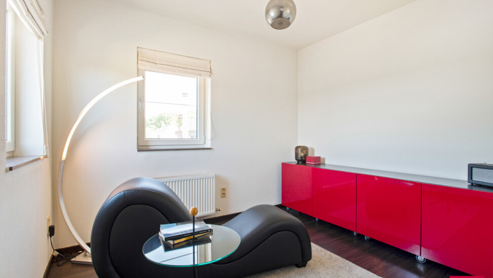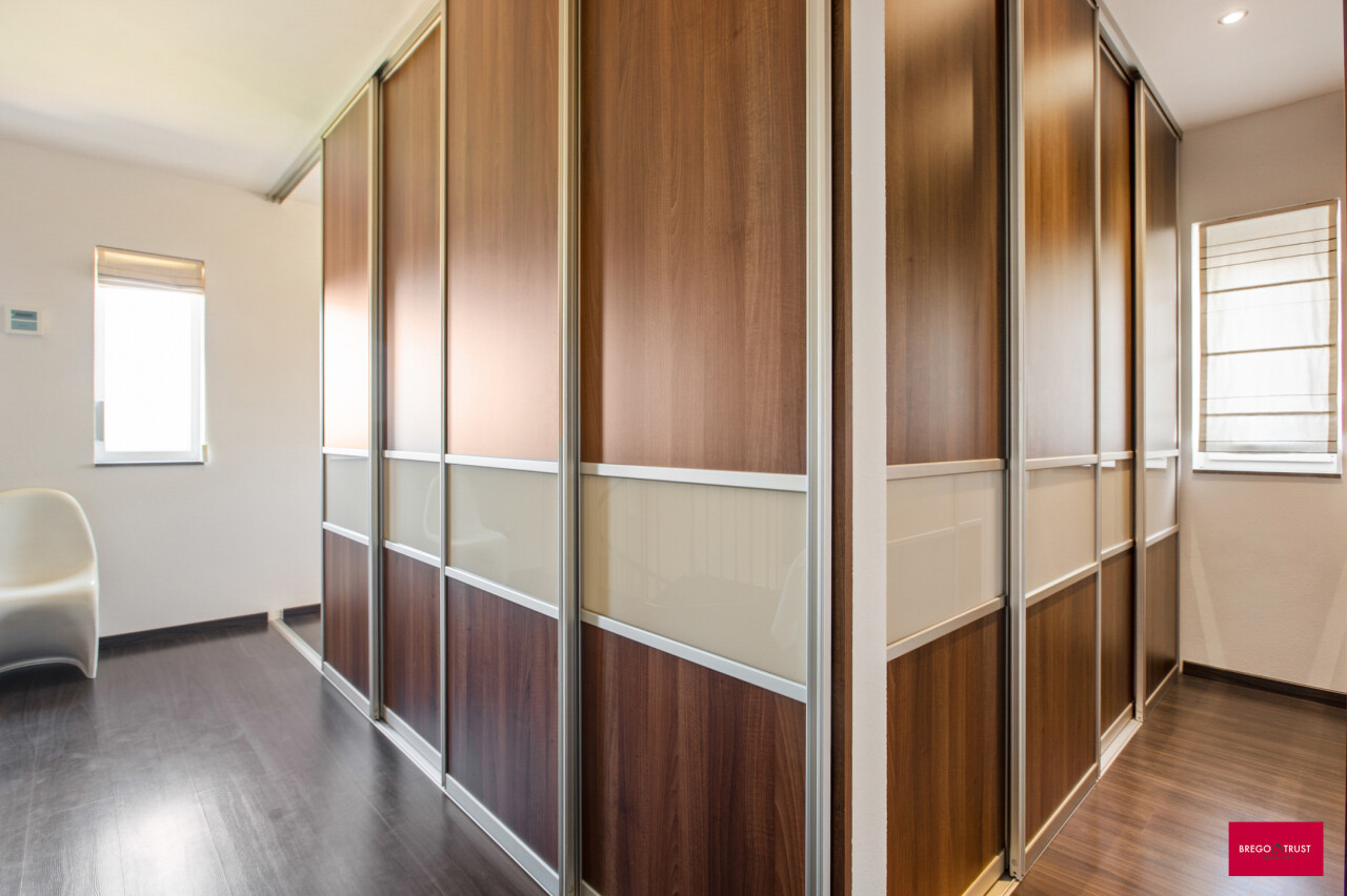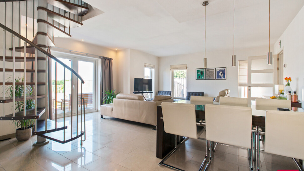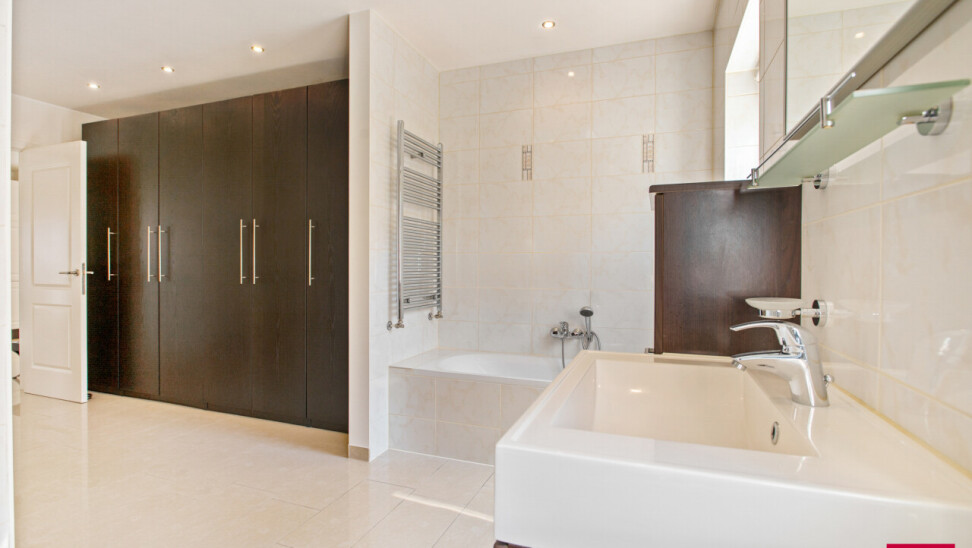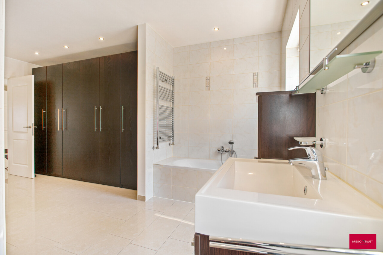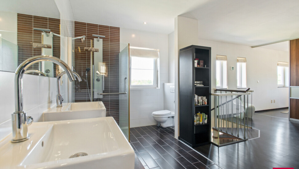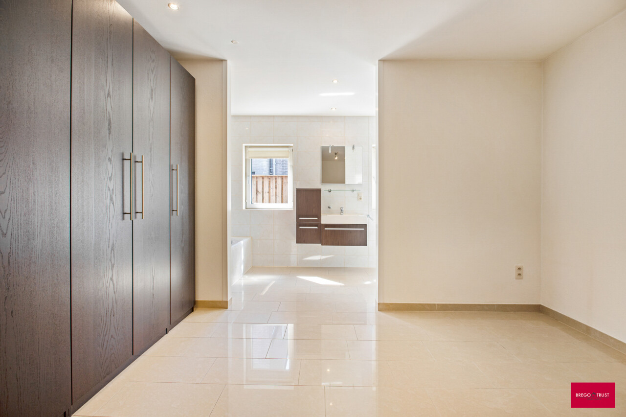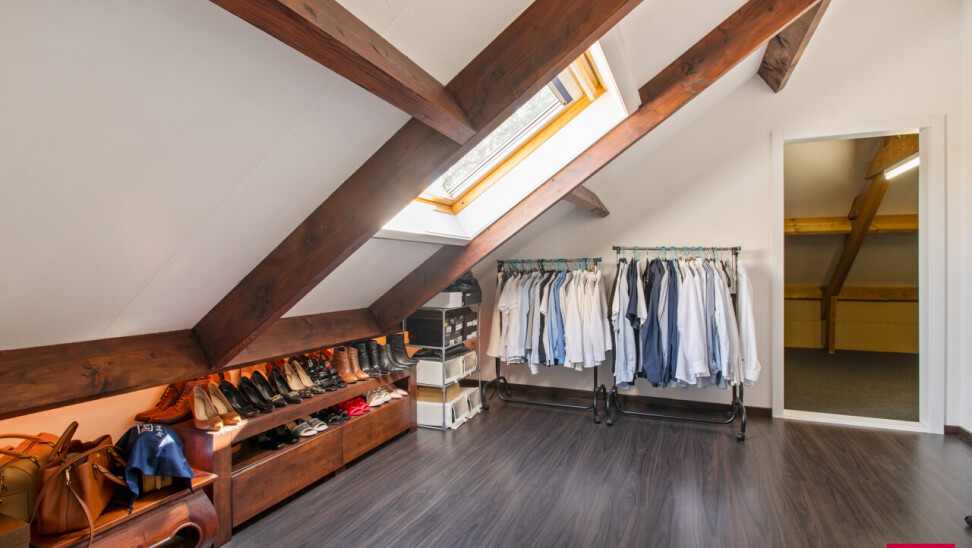 Via de inkomhal bereiken we ook het tweede woongedeelte. Ook hier valt de open leefruimte met keuken meteen op door haar lichtinval en aangename indeling. De bijkeuken zorgt opnieuw voor extra functionaliteit. We nemen de trap naar boven en daar ontdekken we een ruime master bedroom met een elegante ensuite badkamer, die samen een prachtig loftgevoel geven. Daarnaast zijn er nog een extra slaapkamer en een ruime inloopkast voor optimaal comfort. Vanuit deze verdieping is er toegang tot een ruime zolder, die tal van mogelijkheden biedt: extra kamers, hobbyruimte of extra bergruimte.