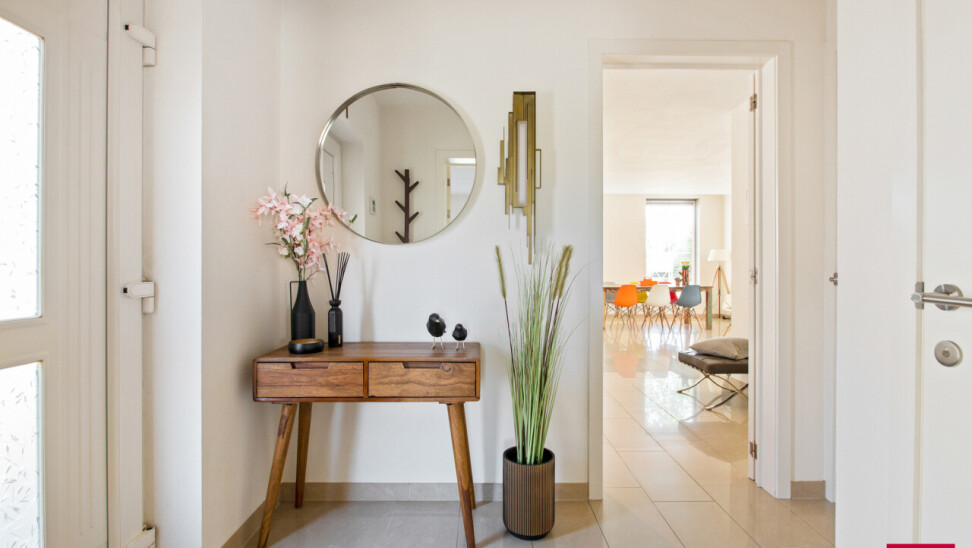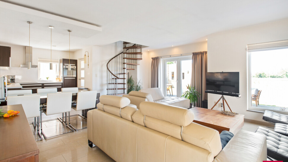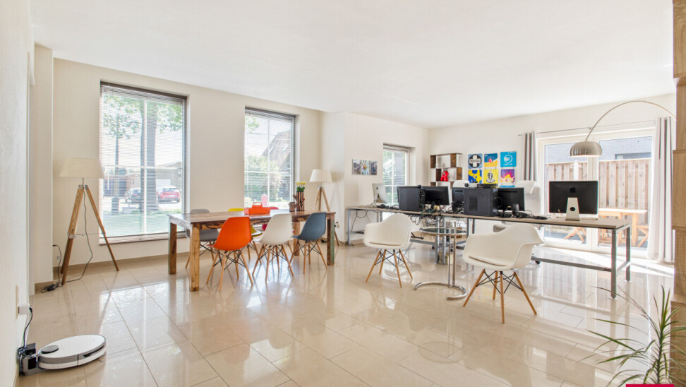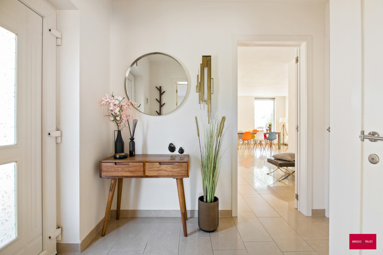 We betreden de woning via de royale inkomhal, die meteen een gevoel van openheid en licht creëert. Vanuit hier heb je toegang tot twee volwaardige wooneenheden, ideaal voor dubbele bewoning, kangoeroewonen of wie wonen en werken harmonieus wil combineren.